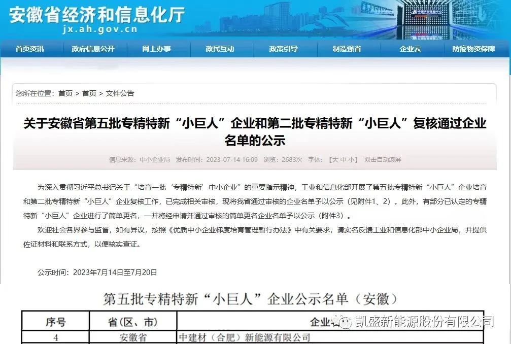 Recently, the Ministry of Industry and Information Technology released the fifth batch of specialized and new "little giant" enterprises and the second batch of specialized and new "little giant" enterprises in the country. China Building Materials (Hefei) New Energy Co., Ltd. was successfully selected as the fifth batch of specialized and new "little giant" enterprises in the country.