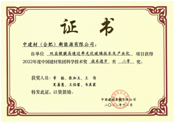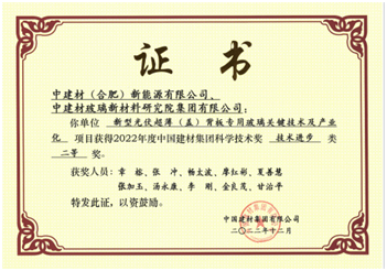 Recently, China National Building Materials Group held the 2022 annual science and technology award review meeting. The two technical achievements of China Building Materials (Hefei) New Energy Co., Ltd., "Key Technology and Industrialization of Special Glass for New Photovoltaic Ultra-thin (Cover) Backplane" and "Technology and Industrialization of High Transmittance Photovoltaic Glass with Double Coating", respectively won the second prize in the technology progress category of the 2022 China Building Materials Group Science and Technology Award.