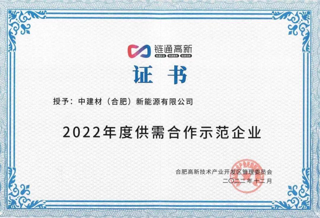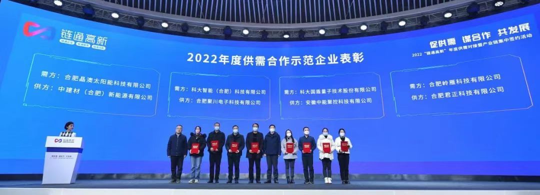 In order to strengthen the exchange and interaction between enterprises, continuously promote the cooperation and docking between supply and demand, accelerate the cooperation and docking between the upstream and downstream of the industrial chain, further demonstrate the rich achievements of "Link High-tech", and commend enterprises and alliances, Hefei High-tech Zone successfully held 2022 annual supply and demand docking and industrial chain centralized signing activities with the theme of "promoting supply and demand, seeking cooperation and common development" in Zhongan Chuanggu Global Roadshow Center. At this meeting, 8 enterprises including China Building Materials (Hefei) New Energy Co., Ltd. won the supply and demand demonstration enterprises that settled in the chain high-tech platform, released the supply and demand list and reached cooperation offline.